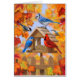 Un bleuet, un geai bleu, une poule, un nuthatch et un cardinal se rassemblent à une mangeoire d'oiseaux pour une fête d'automne, sur un arrière - plan orange de couleur automne. Oeuvre créée à partir d'une peinture originale de l'artiste faunique Crista S. Forest.