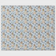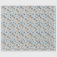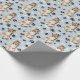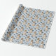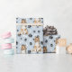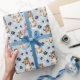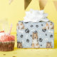 Ein Bild eines wunderschönen Collie Hundes ist das Merkmal dieses jedes Anlasses Geschenkpapier. Der Hund sitzt inmitten eines Musters aus schwarzen Pfoten und weißen Knochen und wird auf einem silberblauen Hintergrund wiederholt.