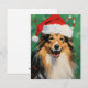Farbenfrohe und fröhliche Weihnachtsgestaltung mit einer Collie, die eine Weihnachtsmannmütze trägt.