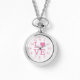 Collier Montre cadeau. Avec le mot "amour" et une forme de coeur remplaçant la lettre O. Rose et blanc