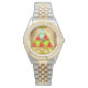 Das Gesicht dieser Armbanduhr ist mit einem roten, kartreusen und hellblauen Pyramidendesign und goldenen Ziffern gemustert. Erhältlich in Männer-, Frauen- und Kinderstilen.