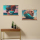 A skull head has been completely colored in an abstract style to bring you into the world of creativity and surreal design, in the style of photo-realistic landscapes, tropical landscapes, futuristic realism, pixelated realism, light crimson and sky-blue, surrealistic dreamscapes