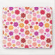 Colorful flower pattern in yellow, orange, pinks, lilac and reds on a cream color background.
