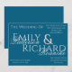 This Design Features a Deep Teal Background and a softer, blue Text. The text combination is a mix of bold and calligraphy. Perhaps the best part about this Invitation is that is comes in multiple colors, so you can mix and match different invitation colors with your other wedding stationary, but everything is designed to be cohesive, no matter what color you pick. We wanted something fun and going "full color wheel" seemed to be the ticket. We home you enjoy this invitation and the coordinating items available in our store.