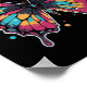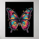 A vibrant illustration features a symmetrical butterfly with intricately patterned wings. The wings are adorned with a mix of colors including pink, teal, and yellow, set against a dark gray base. Small, colorful dots are scattered around the butterfly, adding to the whimsical feel. The background is solid black, which accentuates the bright colors of the butterfly.