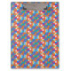Colorful clipboard with a vibrant geometric pattern featuring interlocking shapes in blue, orange, and red. The design conveys a lively, energetic feel.