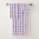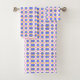 Colorful geometric patterned towels are displayed; they feature a repeating design of purple, yellow, and pink shapes, conveying a vibrant and lively tone.
