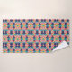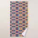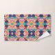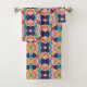 Colorful geometric-patterned towels hang on a silver rod, showcasing vibrant shades of blue, pink, yellow, and red. Below, a matching washcloth is neatly displayed.