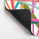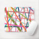 This mouse pad has a geometric design of scattered lines in floral colors – shades of pink, orange, yellow, blue, and green.