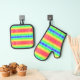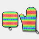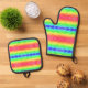 Colorful pot holder and oven mitt set with vibrant rainbow stripes and a black border on the front. The back features textured, solid black fabric.