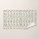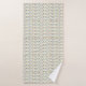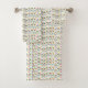 "Two images display a colorful rainbow-patterned towel set and washcloth. The towel set hangs neatly on a silver rod, while the washcloth is folded, exposing both its vibrant design and soft white lining, conveying a cheerful and cozy atmosphere."