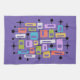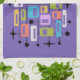 This artwork radiates mid-century modern energy, layering vibrant rectangles and squares of orange, green, blue, pink, purple, and white within a black grid of lines and dots. The composition is punctuated by playful black starbursts, evoking the optimism of the atomic age. Set against a deep purple background, the symmetry and bold color contrasts create a dynamic rhythm that feels both retro and timeless. The piece captures the spirit of 1950s–1960s design while offering a fresh, contemporary vibrancy.