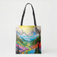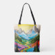 This unique tote bag features a creative and colorful river valley mountain landscape illustration. This shopping bag would make a wonderful gift idea.
