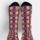Colorful socks with vibrant abstract patterns in orange, purple, and black. The design features geometric shapes and swirling motifs, creating an energetic, playful tone.