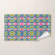 A colorful towel set with vibrant geometric patterns in blue, pink, yellow, and green hangs on a rod. A matching washcloth is folded below.