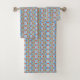Colorful towels with vibrant, symmetrical patterns of red, blue, and yellow leaves displayed on a rack and flat surface, conveying a lively, decorative vibe.