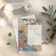 Ces invitations de mariage de 5 po x 7 po présentent un motif abstrait de feuilles dans les tons d'épinette bleue, de piment, de caramel et de brun roux avec des espaces réservés, "Avec leurs familles, s'il vous plaît rejoignez", les prénoms et prénoms de mariée et mariée, "pour leur mariage", date, heure, nom et adresse du mariage, "accueil à suivre".