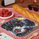 Teller aus Halloween-Party. Schwarz-Gold Vampir mit goldenen Reißzähnen und Augen Comic Buch Pop Kunst ai Art. Cool für Halloween oder alle, die Lieben Vampire..