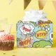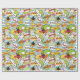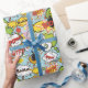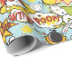 Comic-Buchverpackungspapier mit Redewendungen mögen Boom! Kriegsgefangen! und Poof! Kanonenkugeln und Gedanke bewölkt sich in den Farben von Rotem, gelb, grün auf einem hellblauen Hintergrund.
