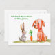 Wasserfarbene Comic Katze mit sonnigen Ohren und sitzt neben einer Osterkarotte. Sonnige und festliche Frühlingsillustrierung voller Charme und Feiertagssjubiläum.