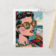 Urlaub Postkarte, um in Touch behalten. Coole Ai-Kunst, die eine Frau darstellt, die im Urlaub am Strand zurücktritt und dabei eine Hula-Tänzerin sieht. Dies wird in einem Comic Buch Art Stil getan, die einen Pop Art Retro-Look geben.