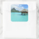 sticker photo souvenir carré avec un luxueux complexe de bungalows sur l'eau dans le lagon bleu clair de l'île pacifique de Bora Bora, près de Tahiti en Polynésie française.