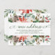 Cette carte de vœux tendance pour les fêtes de fin d'année présente un cadre de fleurs de Noël rouges et blanches à l'aquarelle, avec une verdure festive, des pommes de pin et des baies. Les mots "nouvelle adresse" apparaissent dans une calligraphie verte élégante et tourbillonnante. Une annonce de déménagement pour Noël simple mais élégante que vous serez fier d'envoyer à vos amis et à votre famille.