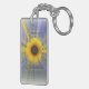 Un tournesol jaune est présenté dans ce design à l'infini. Le arrière - plan bleu marie le jaune et le marron du tournesol. Le même design se trouve à l'avant et à l'arrière de ce porte - clé.
