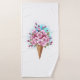 Cône gaufre douce avec fleurs de cerisier japonais rose frais sur arrière - plan blanc avec stries d'aquarelle bleue. Cerise japonaise rose.