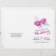 Deux cônes simples à deux faces dessinés en mauve violet avec aiguilles de pin bleu marine sur un programme de mariage arrière - plan blanc. Une partie des cônes de pin de mariage d'hiver stationnaire. Joli violet, blanc et bleu marine. Modifiez ce programme de mariage avec votre propre nom, dates, libellé de la cérémonie, accompagnateurs de mariage et merci. Un programme simple mais élégant remplace simplement l'exemple de texte par vos informations de mariage et plie les programmes en deux à la livraison. Programme de cérémonie de mariage de nature moderne et romantique. Dessin et design par Sarah Trett www.mylittleeden.com