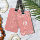 Chic monogrammed bagage tag en corail tropical et blanc dispose de confetti blanc qui pleut du haut et du bas, avec votre unique monogramme initial au centre en blanc script de calligraphie moderne. Customisez le dos avec vos coordonnées complètes en lettres blanches modernes sur un arrière - plan rose corail paqueté assorti.