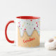 Hier ist eine lustige Tasse, die ein tolles Geburtstagsgeschenk macht, wenn sie mit der Lieblingsküche des Empfängers gefüllt ist! Das Muster ist ein Waffelkonus mit weißer Vereisung. Die Vereisung ist voll mit bunten Konfetti-Punkten. Eine Seite hat einen roten individuelle Name.