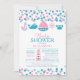 Moderne Konfetti Wasserdusche für ein kleines Mädchen. Unser zeitgenössisches und unterhaltsames Mädchenduschbad lädt mit hübschem pastellrosa & blauen Konfetti-Set auf weißem Hintergrund mit rosa & blauen Segelbooten, Walen, Schiffsrad, Anker & Krabbe ein.