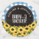 Table de baby shower rustique bleu en vichy barbecue confetti avec tournesol, en vichy bleu, un coeur mignon, et deux photos.