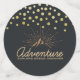 Table confetti avec une illustration de couleur or sur un arrière - plan gris-noir. Conçu avec une illustration d'une montagne avec les rayons de soleil brillant vers l'extérieur de derrière. La typographie dit : La vie est une aventure explorer la découverte de rêve. Autre texte dit aussi : Classe de 20XX et Fêtes 20XX