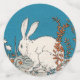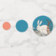 Ce confetti de table a de grands cercles qui sont bleu profond avec un lapin blanc moelleux assis sur le sol entouré de fleurs blanches et oranges. Les cercles moyens correspondent au bleu profond, les petits cercles sont de couleur pêche.