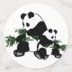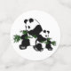 Panda mama est assis à manger du bambou pendant que bébé fait comme bébé panda voit