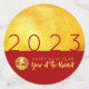 Design moderne avec papier texturé doré (image imprimée) avec grand 2023 en rouge + petit rond Tiger coupé en papier avec des textes jaunes BONNE ANNÉE et Année du lapin sur un arrière - plan rouge. Conception sur confetti de fête. Fournitures de réception, carte d'invitation à plat carré, carte de voeux, carte postale de vacances et plus encore... Parfait pour un Nouvel An chinois moderne et intemporel du lapin 2023.