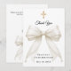 A modern and elegant Confirmation thank you card. A white background, decorated with a large ivory colored bow with pearls and a golden cross. On the front the text: Thank You, name, and a date.