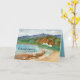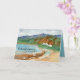 Congratulations on your new beach house greeting card featuring a peaceful seascape with beach houses tucked up against the cliffs with rugged volcanic mountains in the distance. Inspired by a beach on the island of Oahu, Hawaii. On the inside is a coordinating shade of turquoise with text you can edit to fit your needs.