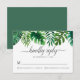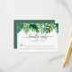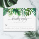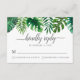 Carte RSVP de mariage tropical avec des feuilles d'aquarelle, dont des feuilles de monstère, de palme et de banane, sur un arrière - plan blanc. L'envers affiche une couleur verte profonde.