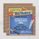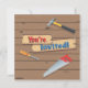 Voici une idée d'anniversaire intelligente pour vos enfants ou cette fête d'anniversaire de Man Cave ! Jetez une fête de construction de temps outil avec cette grande invitation. Planches en bois, clous, marteau, tournevis et un plan avec des informations de fête contre un arrière - plan boisé rustique. Placez l'âge sur le ruban de mesure et le prénom sur la planche de bois. Illustration tirée à la main par McBooboo.