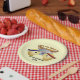 Dieses helle Papier-Plattendesign zeichnet sich durch ein paar lustige, heftig aussehende Cookie-Figuren aus, die sich vor einer Mischschüssel und Holzlöffeln unter einem gewölbten Textbild mit dem Titel "Let's Get Ready to Crumble!" absetzen. Es ist einfach, für Ihre Bake-off-Veranstaltung zu gestalten.