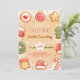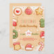Un biscuit de Noël décorant l'invitation de la fête. Sur un arrière - plan de pâte à biscuits, les biscuits décorés de glaçage comme des baubles, des bas, des arbres de Noël, des étoiles, des cloches et des chapeaux santa sont entourés de farine et de saupoudrées de gâteaux verts et rouges. La date de l'événement est affichée dans une étoile coupée du mélange de biscuits.