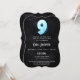 Notre invitation unique à la fête de 9e anniversaire a un âge cool, bleu 3D assis au-dessus d'un ciel étoilé noir sur l'avant et l'arrière. Une formidable invitation à l'anniversaire pour un super anniversaire.