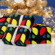 Groovy Friedenszeichen, rot-blau-grün gelb auf schwarzem Hintergrund. Passen Sie das Bild mit Ihrem eigenen Text an, verkleinern Sie es. Vintage niedliche mädchenhafte künstlerisch trippie hippie sechziger Muster.