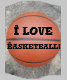 Basket orange avec bandes noires contre un arrière - plan en béton gris. I Love Basketball est écrit en texte noir avec des globes oculaires qui rebondissent. Photographie et citation d'origine © 2012, 2017 TamiraZDesigns.