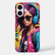 A cool girl wearing sunglasses, headphones and colorful clothes with purple hair. the background is full of splashes of paint. street art