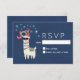 Une carte RSVP de Noël avec une drôle d'illustration. Un mignon lama portant des lunettes de soleil noires et un chapeau de santa rouge. Portant également une couverture de style sud-américain et des pom-poms. Le mot Joy écrit au-dessus de sa tête dans une police festive et colorée. Des flocons de neige bleus tombent. Placez-vous sur un arrière - plan bleu. Design fantasque et amusant à thème de Noël.