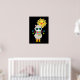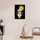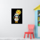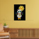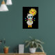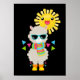 A poster with a cool looking llama wearing some dark sunglasses. Dressed in a colorful striped scarf and fun little boots. A bright yellow sun with a happy kawaii face in the background. Whimsical colorful triangles surround this fun loving llama. Black background.